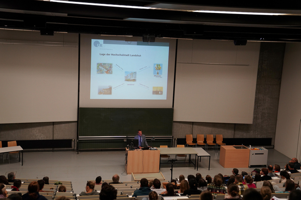 Prof. Schmidt präsentierte im Rahmen einer Infoveranstaltung rund 150 anwesenden Kollegen – zu denen der Vorstand der LAKUMED Kliniken die Studierenden kurzerhand erhob – jedoch nicht nur die Forschungs- und Versorgungsschwerpunkte des Klinikums Landshut, des Kinderkrankenhauses St. Marien und der LAKUMED Kliniken, sondern warb auch allgemein für den Standort und die Vorzüge der Dreihelmestadt. Zusammen mit Prof. Dr. Dr. Matthias Dollinger, Chefarzt der Medizinischen Klinik I am Klinikum Landshut, PD Dr. Lorenz Rieger, Chefarzt der Klinik für Gynäkologie und Geburtshilfe am Krankenhaus Landshut-Achdorf, und Wiebke Wallach, Koordinatorin für den MCN-Standort Landshut, stand jener ferner anschließend für die zahlreichen Fragen der Studierenden zur Verfügung und versicherte diesen umfangreiche Bemühungen hinsichtlich Wohnsituation, Sport- und Mobilitätsangebote, sowie sozialer Anbindung an die nach der Fusion fast 5.000 Mitarbeiter zählende Gemeinschaft der LA-Regio Kliniken.