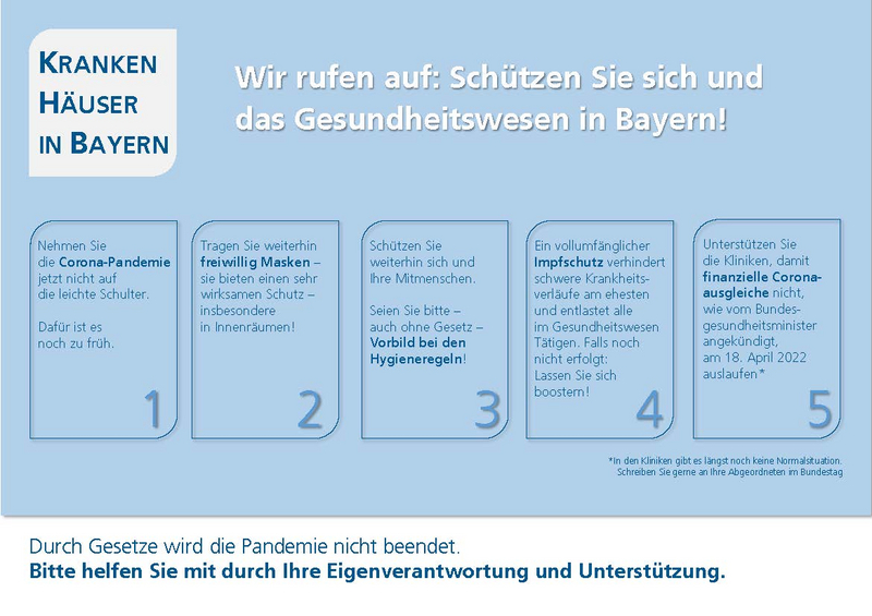Bereits mehr als die Hälfte der bayerischen Krankenhäuser haben sich spontan binnen weniger Stunden dem Appell angeschlossen, der fünf wichtige Punkte an die Eigenverantwortung der Bürgerinnen und Bürger in Bayern richtet und auf die besonders bedrohliche Lage in den Kliniken aufmerksam macht: